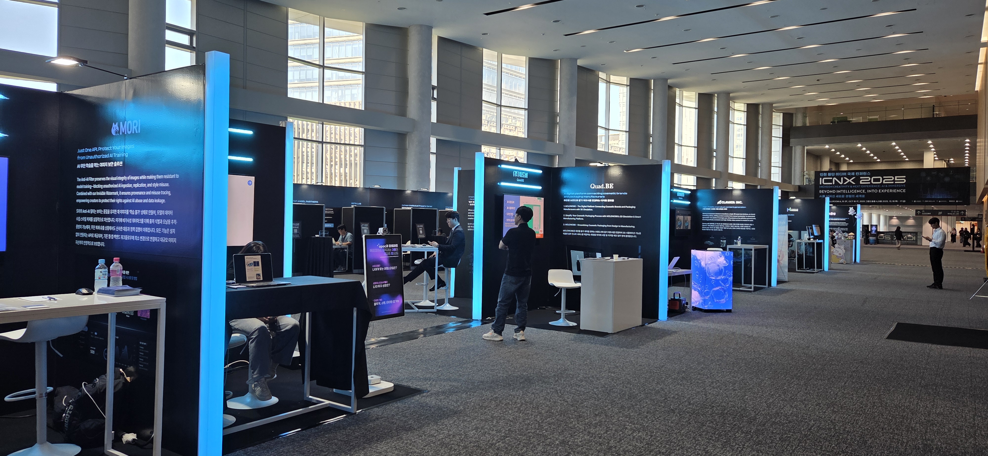 행사장 입구에 차린 14개 업체 부스는 등을 맞대고 검정색 보드판으로 둘러 쌓여있다. 부스 경계는 아크릴박스를 따로 접어 세로로 길게 붙였고 내부에 푸른색 조명을 넣었다. 멋있게 보이는 만큼 돈도 들었으리라.