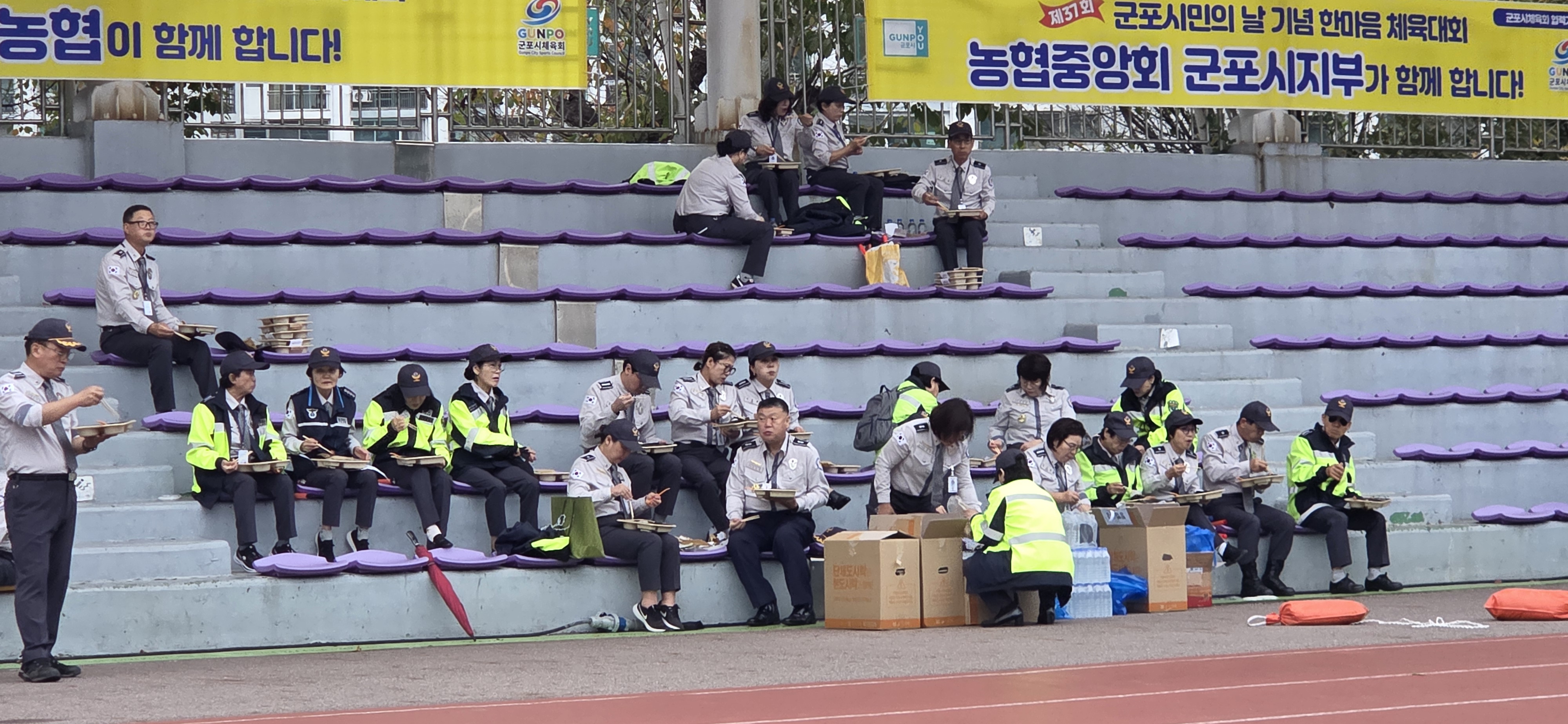 오후6시 빗방울이 떨어지기 시작하는 체육광장 스탠드에 모인 대원들이 도시락을 먹고 있었다. 국회의원부터 도의원,시의원들이 연이어 대원들에게 인사를 하고 나서야 기념식장으로 들어간다.