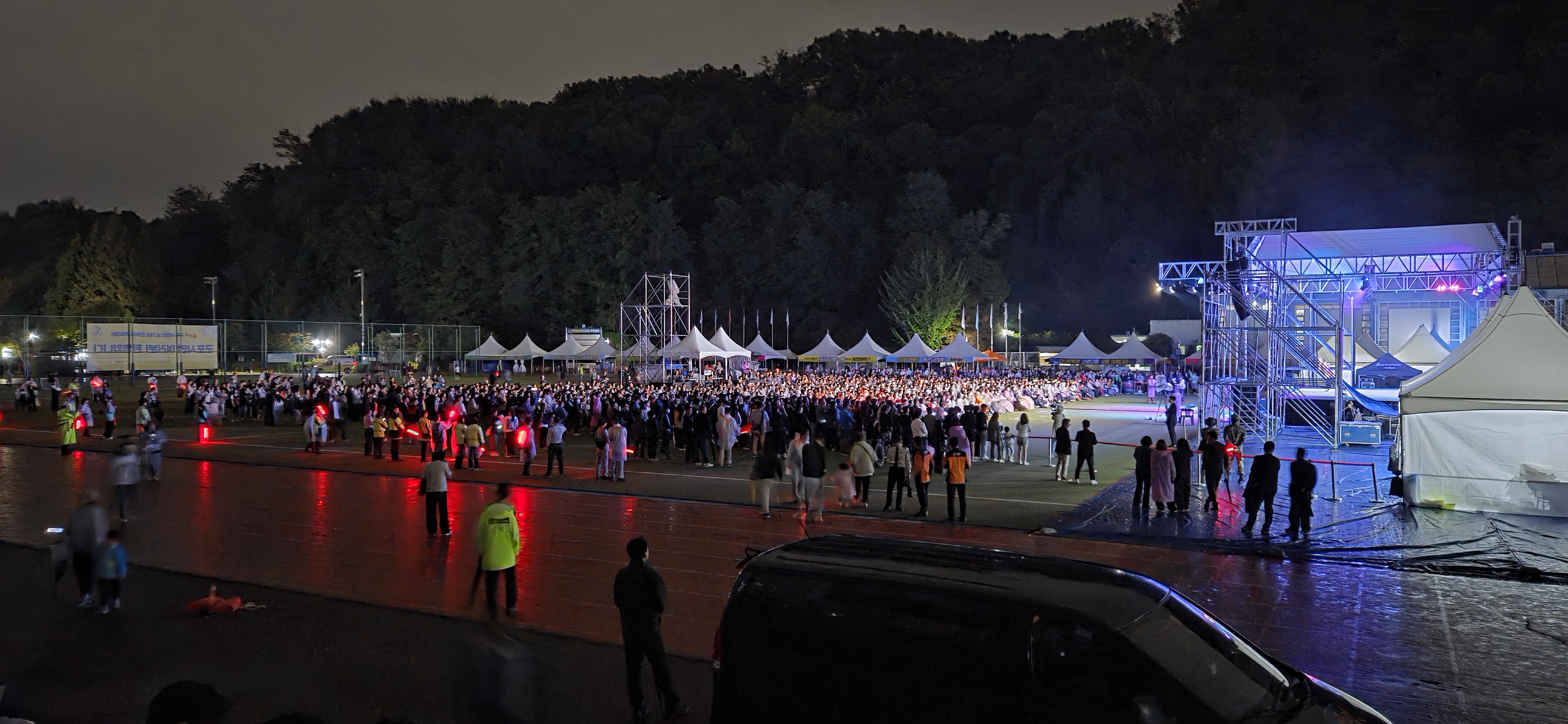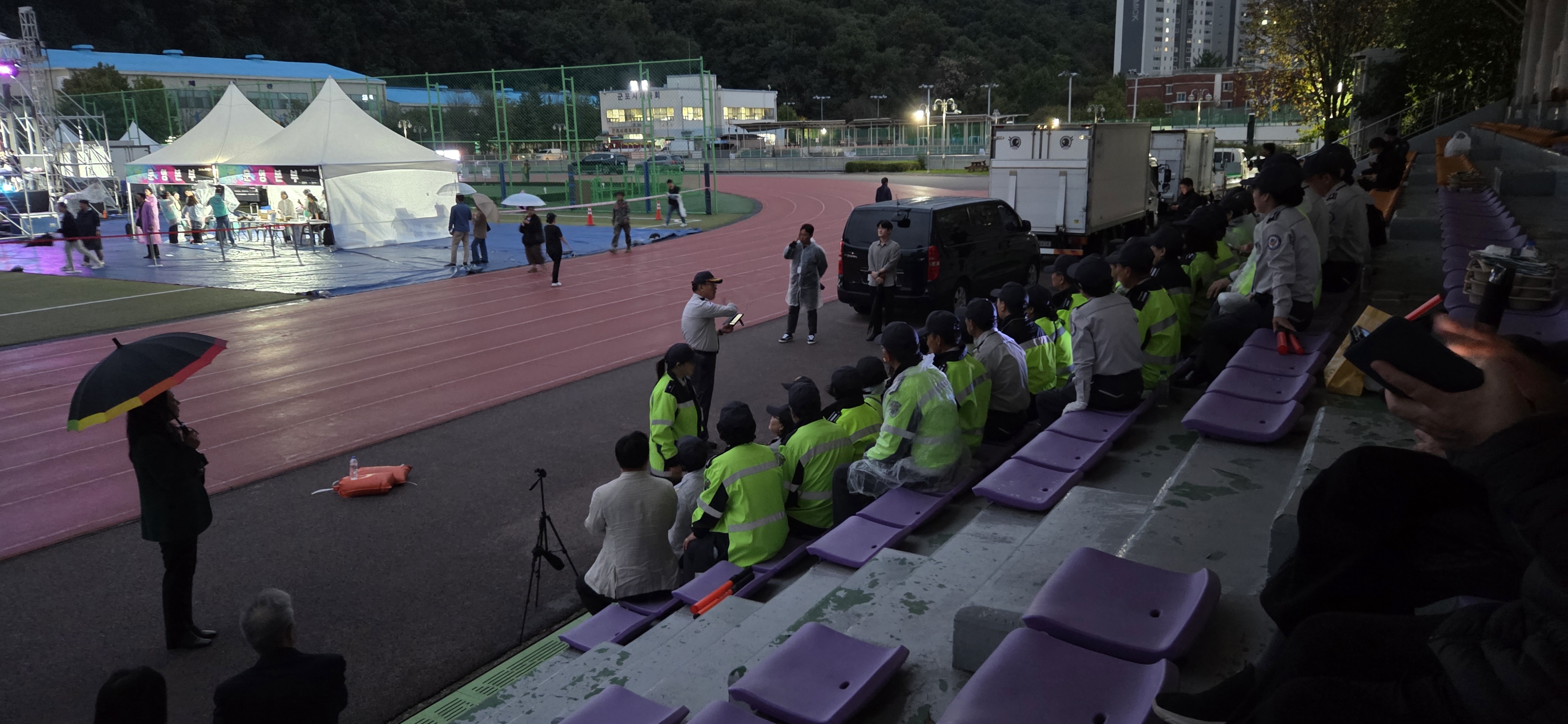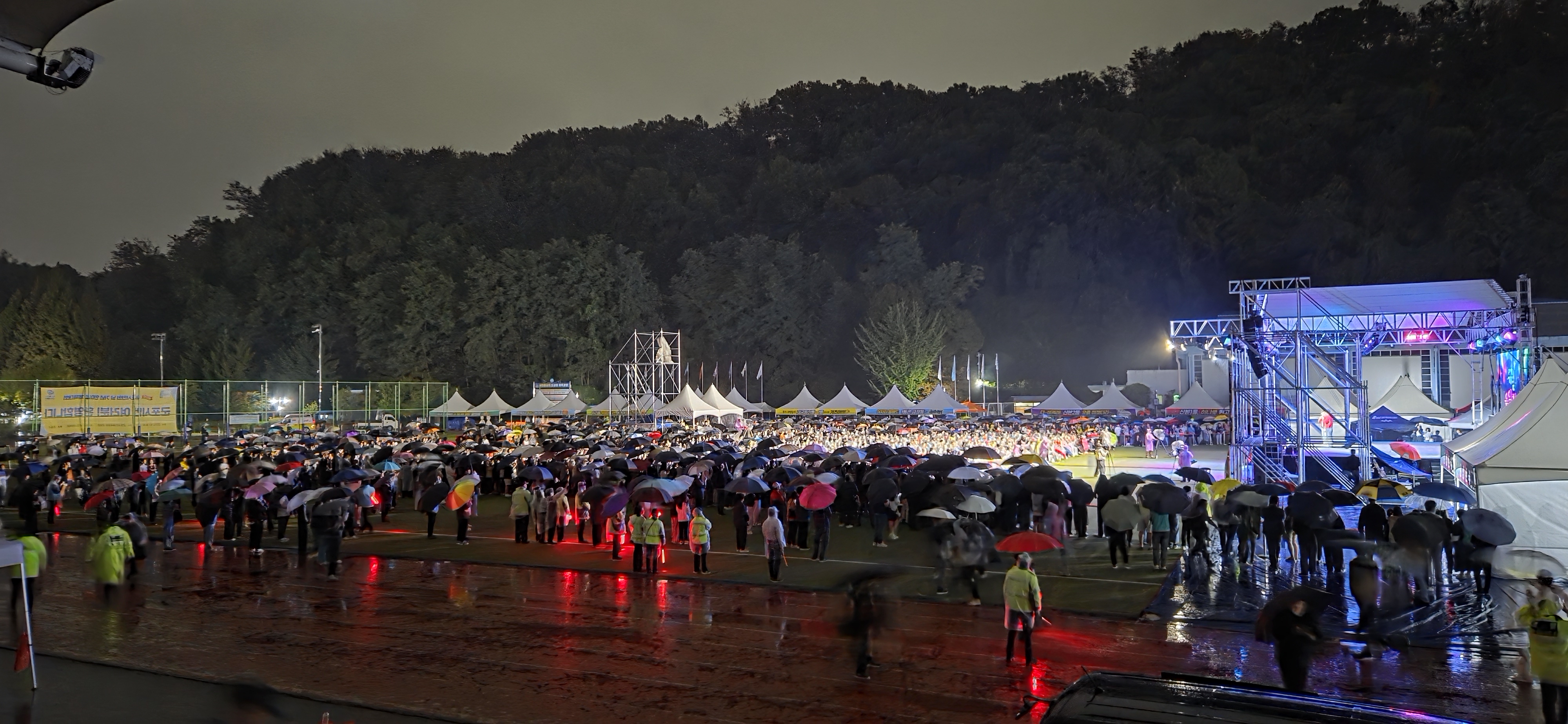 공연 중반이 넘어가면서 빗방울이 거세지기 시작하고 경광봉을 든 자율방범대원들이 객석 바깥쪽에서 2군데 출구쪽으로 흩어지면서 집으로 돌아가는 시민들을 유도한다.